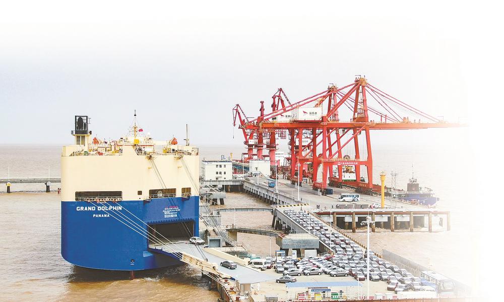 1376輛悅達(dá)商品車依次開往鹽城港港口公司滾裝碼頭前沿裝船。 記者 王焱 攝