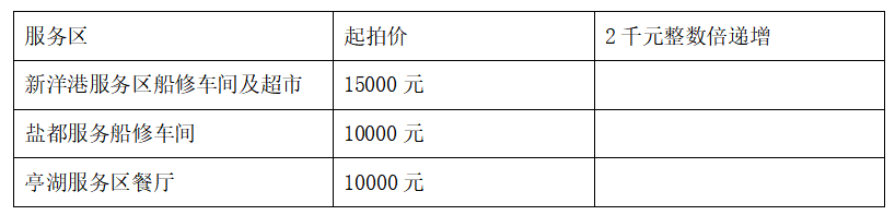 競(jìng)拍形式:公開競(jìng)拍,拍租期限為1年,每個(gè)服務(wù)區(qū)的競(jìng)拍按起拍價(jià),2千元整數(shù)倍遞增(如2000、4000、6000、8000……)。如下表:
