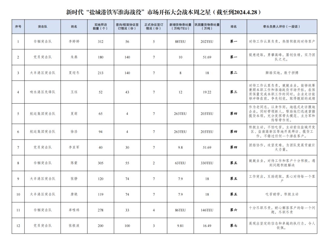 第一名:巾幗突擊隊 李婷婷(拜訪客戶312家,簽訂意向協議56份,簽訂正式協議5份,新增貨物吞吐量88TEU,鞏固量貨物吞吐量202TEU);黨員突擊隊 朱燕(拜訪客戶180家,簽訂意向協議140份,簽訂正式協議7份,新增貨物吞吐量10萬噸,鞏固量貨物吞吐量51.69萬噸)