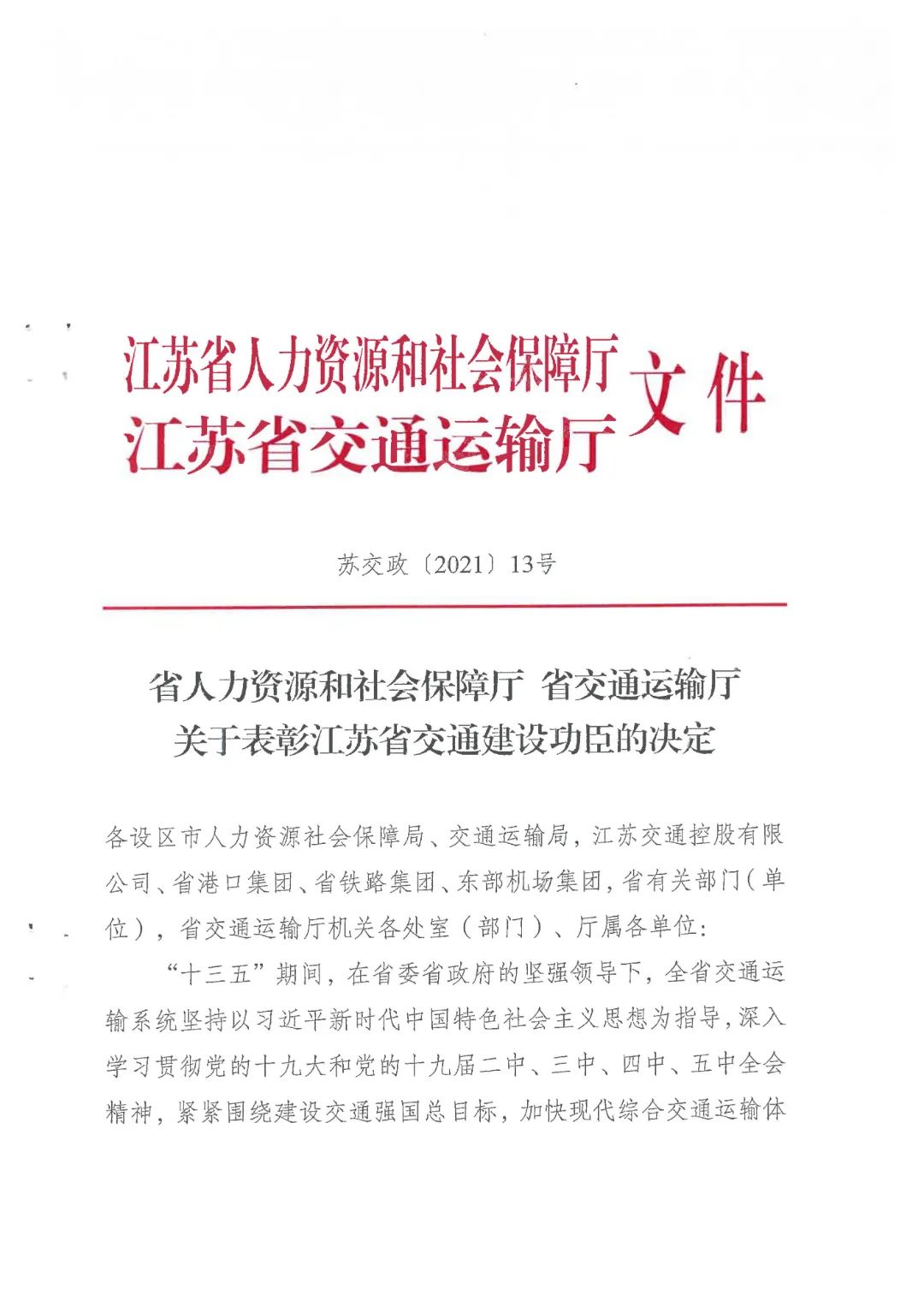 近日,省人力資源和社會(huì)保障廳、省交通運(yùn)輸廳印發(fā)《關(guān)于表彰江蘇省交通建設(shè)功臣的決定》,集團(tuán)下屬響水港集團(tuán)有限公司榮獲“江蘇省交通建設(shè)有功集體”表彰。