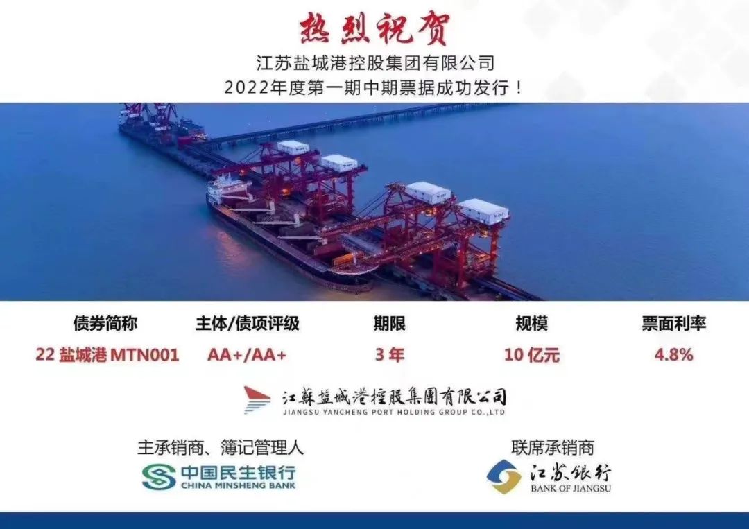 9月21日,鹽城港集團(tuán)2022年度第一期中期票據(jù)成功發(fā)行,金額10億元,票面利率4.8%,進(jìn)一步提振了資本市場(chǎng)對(duì)鹽城港集團(tuán)發(fā)展的信心。