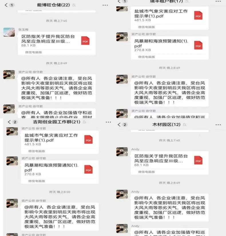廣宣傳 強提醒。公司安全環(huán)保部密切關注臺風動向,加強預警預報,第一時間通過工作群轉(zhuǎn)發(fā)《鹽城市氣象災害應核對工作提示單》及各類預警信息,通過層層宣傳,擴大臺風預警范圍,一方面提示小區(qū)居民做好戶外物品收回、非必要不出門等安全防范工作;另一方面提高承租戶應對防御臺風的重視程度。