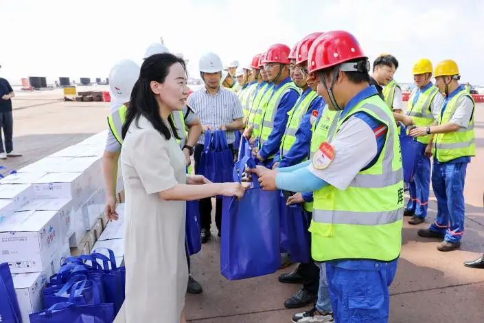 活動現(xiàn)場,袁欣與大家親切交談,詳細(xì)詢問一線職工的工作狀態(tài)和實際需求,對他們頂烈日、戰(zhàn)酷暑,始終堅守崗位的敬業(yè)精神表示衷心感謝,叮囑他們要注意防暑降溫,做好個人防護(hù),并將防暑降溫“清涼禮包”送到職工代表手上。她說,當(dāng)前高溫、惡劣天氣逐漸增多,各單位要切實做好夏季防暑降溫工作,動態(tài)調(diào)整作業(yè)時間,為廣大員工提供清涼舒心的休息場所,全面保障人身安全。同時,要時刻繃緊安全這根弦,聚焦生產(chǎn)、消防重點領(lǐng)域,常態(tài)化開展安全隱患排查治理工作,做好值班值守和應(yīng)急處置,確保港區(qū)安全生產(chǎn)形勢穩(wěn)定。