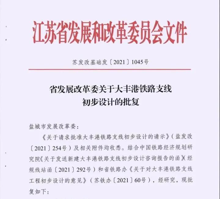 根據(jù)批復,大豐港鐵路支線起自新長鐵路大豐西站南端,止于大豐港站,正線線路全長 50.622 公里,新建鐵路正線、大豐港站以及大豐港物流中心,接軌改建既有新長鐵路大豐西站,預留大豐南站,技術(shù)標準為國鐵 II 級,單線。項目總投資估算為45.4億元,批復建設(shè)工期為2.5年。