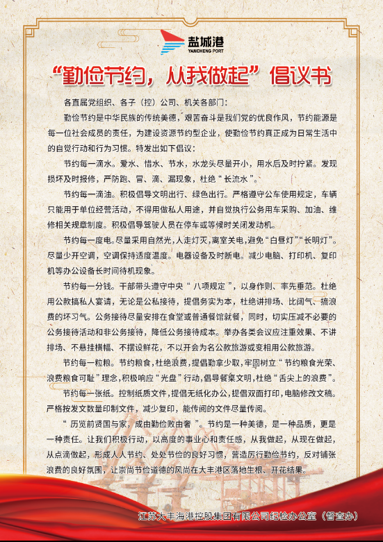 為進(jìn)一步提高廣大干部職工對保持“艱苦奮斗、勤儉節(jié)約”重要性的認(rèn)識,推動建設(shè)節(jié)約型企業(yè),形成“人人講節(jié)約、事事講節(jié)約”的良好風(fēng)尚。12月4日,大豐港區(qū)組織開展“勤儉節(jié)約、從我做起”主題實(shí)踐活動。