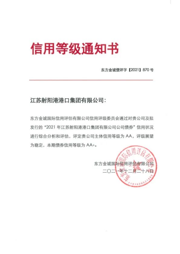近日,經(jīng)過國內(nèi)權(quán)威信用評級機(jī)構(gòu)的綜合分析與評估,江蘇鹽城港射陽港開發(fā)集團(tuán)有限公司榮獲AA級主體信用評級,評級展望為穩(wěn)定,成為繼江蘇大豐海港控股集團(tuán)有限公司之后,鹽城港集團(tuán)合并范圍下屬內(nèi)第二家AA級主體信用評級子公司。