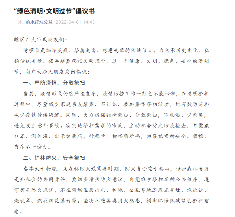 沒有一個冬天不可逾越,沒有一個春天不會到來。非常時期的特殊清明,堅守,就是一份力量;平安,就是一份希望。響水港區青年志愿者與您同行,從現在做起、從自身做起、從點滴做起,做文明祭掃的踐行者、傳統文化的傳承者、告別陋習的先行者,為守護青山綠水,建設美麗港城作出自己應有的貢獻。