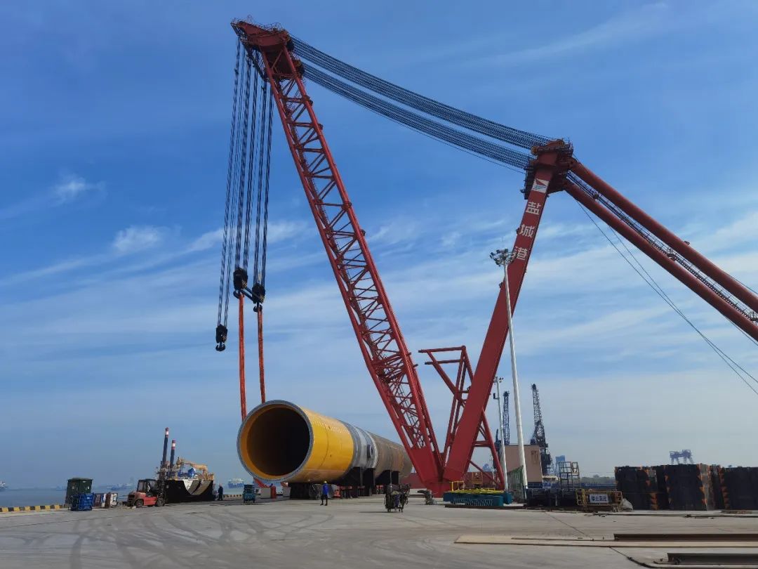 5月28日,鹽城港響水港區(qū)小蟒牛作業(yè)區(qū)公用重件碼頭現(xiàn)場一派繁忙景象,由公用重件碼頭后方陸域打砂除銹噴涂并進(jìn)行拼接組裝的首件風(fēng)電樁基,通過自行模塊車運(yùn)輸至碼頭前沿。該件總長75米、直徑8米、總重達(dá)1055.1噸,由1100t-51m巨無霸固定桅桿吊穩(wěn)穩(wěn)吊起,緩緩地放置在駁船擱置梁上,出海駛向渤海風(fēng)電建設(shè)現(xiàn)場。