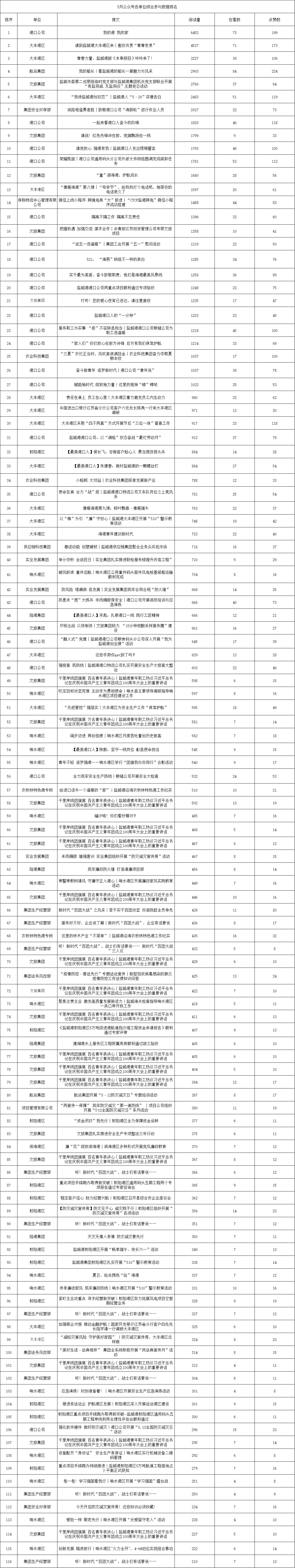 5月,集團微信公眾號共發(fā)布116篇文章。總體閱讀數(shù)約9.5萬,各單位發(fā)稿更加活躍,希望大家保持一如既往的熱情,積極踴躍發(fā)稿,用最真實的數(shù)據(jù),為集團沖刺“雙過半”貢獻文字力量。