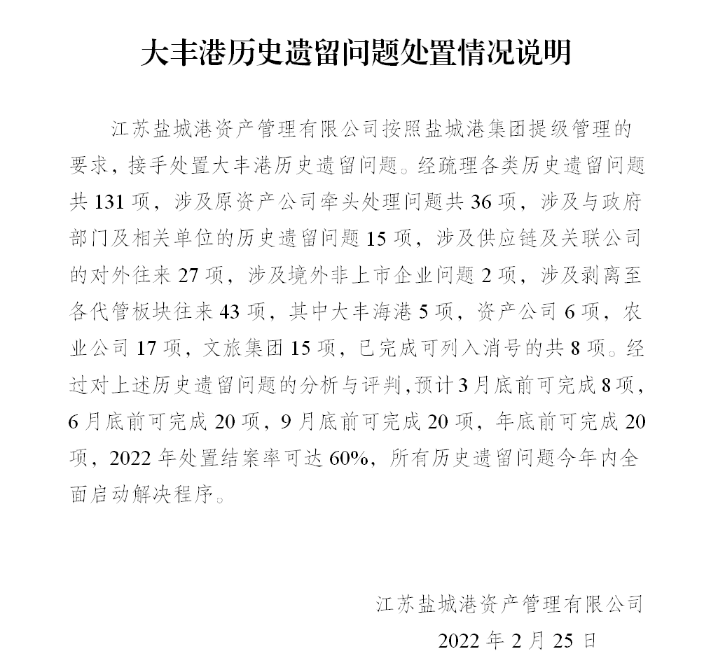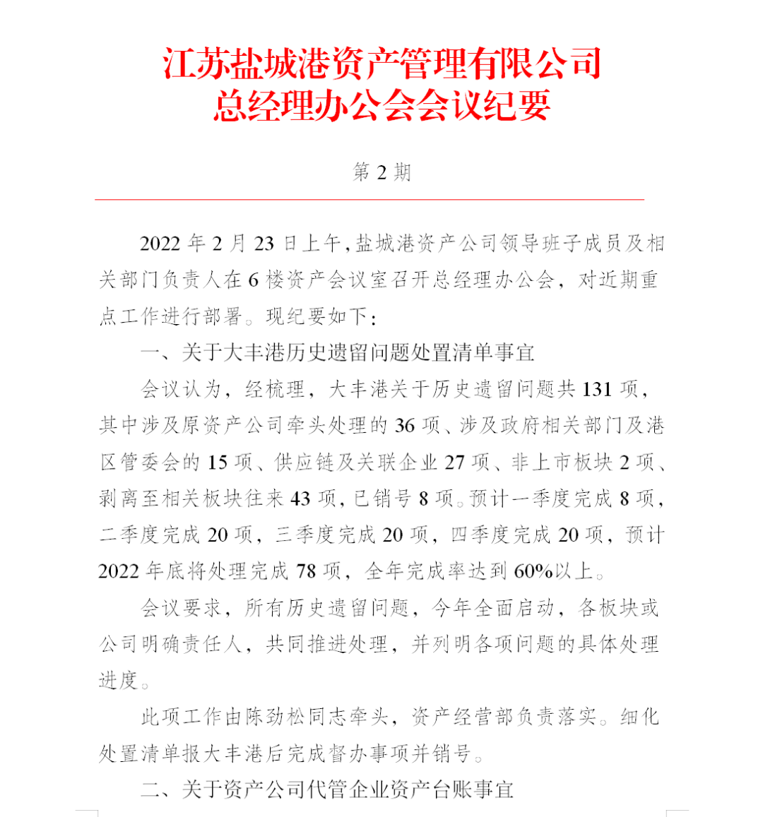 處理處置完成大豐港區(qū)閑置、低效資產(chǎn)2.58億元,其中:有問題在建工程0.49億元,有問題待攤費用0.54億元。目前正在加快推進奧特萊斯、和順環(huán)保科技、港鑫銅業(yè)、市民卡、水務(wù)公司、蘇港包裝等企業(yè)的資產(chǎn)處置工作。
