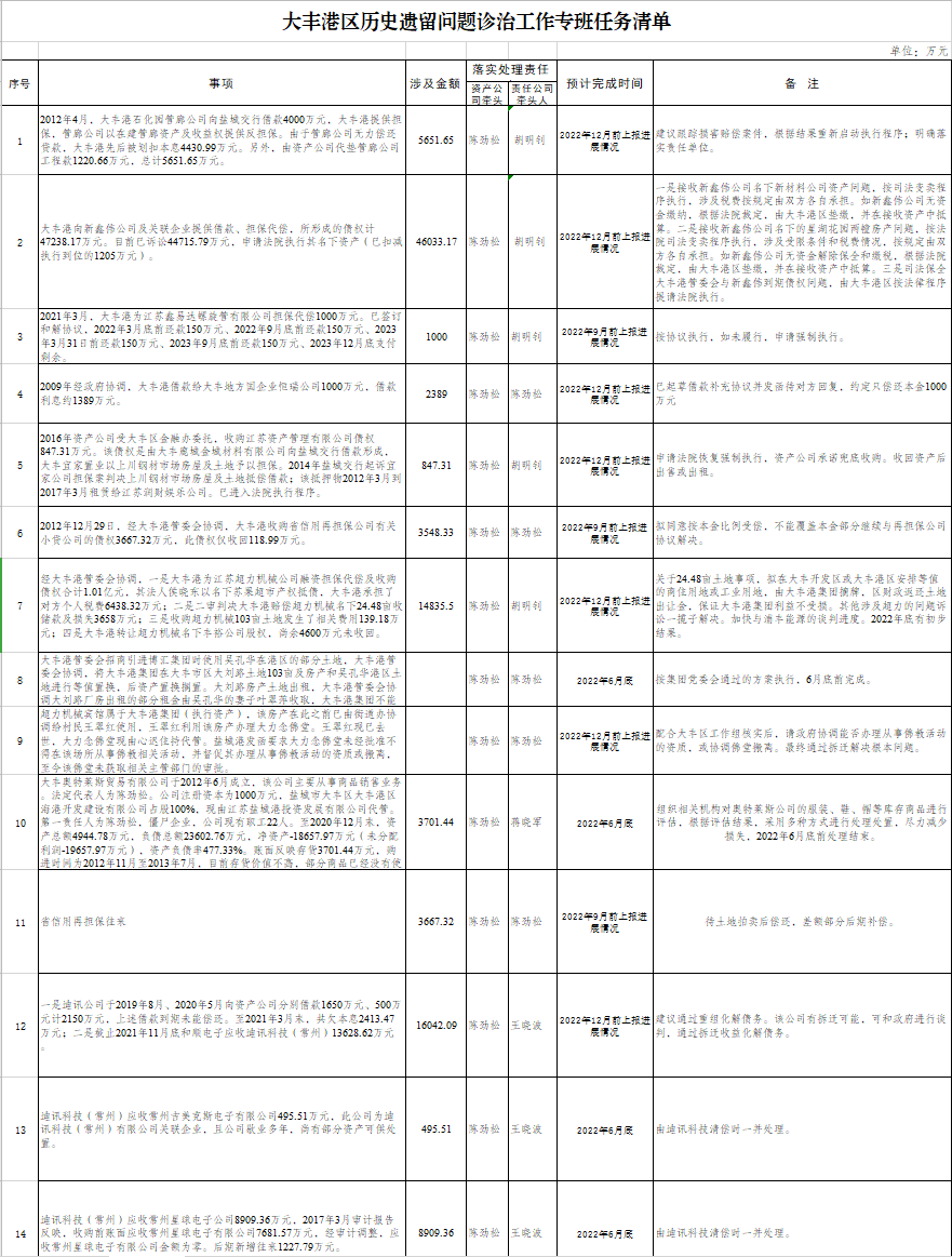 在“六清”的基礎(chǔ)上,梳理大豐港區(qū)歷史遺留問題診治工作專班任務(wù)清單計97項,并完成任務(wù)清單說明;完成江蘇大豐海港控股集團有限公司涉及“國企債券專項審計調(diào)查發(fā)現(xiàn)問題整改工作”,并將整改工作采取的措施和整改進展情況等形成工作報告上報大豐區(qū)國資委;共計處理處置大豐港區(qū)歷史遺留有問題往來74筆,金額8.09億元。截至5月31日已完成大豐港區(qū)歷史遺留問題診治工作專班任務(wù)清單計15項,涉及金額2.81億元。