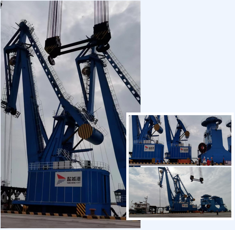 據(jù)悉,本次抵港門機(jī)為2臺(tái)40-43門座式起重機(jī),由上海振華重工為小蟒牛作業(yè)區(qū)量身定制,具有吊運(yùn)噸位高、抓取距離遠(yuǎn)、故障率低等特點(diǎn),可搭配抓斗、吊鉤、吸盤等多種吊具,靈活切換作業(yè)模式,操作性能強(qiáng),作業(yè)效能高。為確保兩臺(tái)門機(jī)及時(shí)安全落戶響水港區(qū),集團(tuán)設(shè)備技術(shù)部統(tǒng)籌協(xié)調(diào),響水港區(qū)生產(chǎn)經(jīng)營(yíng)部、投資發(fā)展部積極配合,根據(jù)航道情況及靠泊條件,采用門架和轉(zhuǎn)盤分離的方式運(yùn)輸,大輪靠泊后先用浮吊將門架部分吊裝上岸落軌后,再將轉(zhuǎn)盤部分吊至門架上筒體處通過高強(qiáng)度螺栓連接的方式完成整機(jī)的總裝。后續(xù)這兩臺(tái)門機(jī)將進(jìn)入調(diào)試階段,投產(chǎn)指日可待。