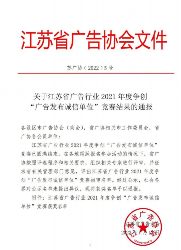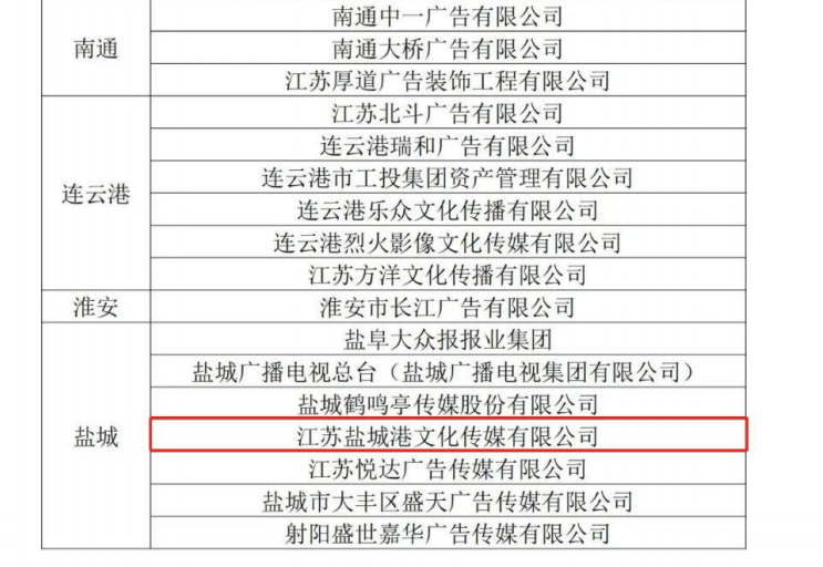 7月16日,2021年度江蘇省廣告行業(yè)廣告發(fā)布誠信單位評選結(jié)果公布,江蘇鹽城港文旅集團文化傳媒公司再獲榮譽稱號。