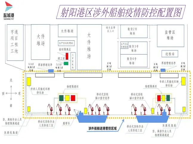 練內(nèi)功,行穩(wěn)筑基“守”規(guī)范。港區(qū)全面貫徹落實水路口岸疫情防控管理規(guī)定,嚴(yán)格按照涉外碼頭防控標(biāo)準(zhǔn),扎實推動碼頭設(shè)備設(shè)施改造升級。港區(qū)根據(jù)水路口岸防控組審定的“射陽港區(qū)涉外船舶疫情防控配置圖”,改造完成了碼頭“三區(qū)兩通道”、“登輪人員梯口值守崗?fù)ぁ薄ⅰ敖缑婀芾韻復(fù)ぁ钡扔布O(shè)施,擴展提升了自有監(jiān)控覆蓋范圍,為射陽港區(qū)口岸對外開放后的涉外船舶“三位一體”管理工作打下堅實基礎(chǔ)。