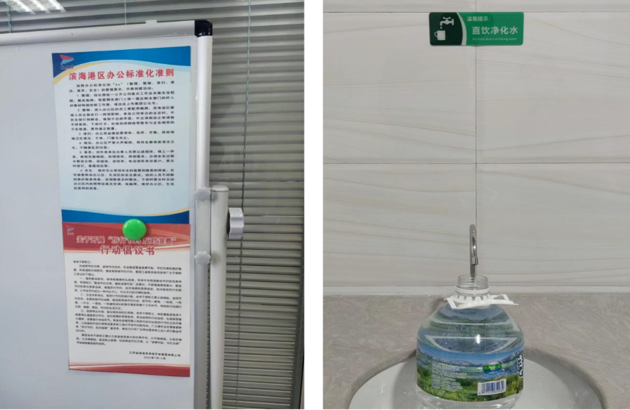 與此同時,濱海港區還在宿舍生活集聚區、辦公區各樓層共安裝了7臺凈化飲水機,一改過去瓶裝用水浪費現象的發生,弘揚了節儉美德,杜絕了鋪張浪費。對公眾場所場地用水處,放置了反對浪費、節約為榮,惜水、愛水(節水,從我做起)、安全用電等宣傳標牌,以多種形式營造綠色節儉、文明用水、安全用電的勤儉氛圍。