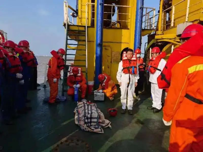 隨后進行的是人員落水演習?!皥蟾?,皮龍隊一人整理皮龍帶時不慎落水?!薄疤旎⑻枴贝L接報后立刻指令駕駛員發(fā)出有人落水警報,并通知交通船協(xié)助救援,同時向項目部、公司調度室報告人員落水情況;打撈隊將落水人員救撈上來后,救護隊采用控水、心肺復蘇等急救措施對落水人員進行模擬救助,經搶救后落水者蘇醒,船長安排相關人員將落水者送往醫(yī)院接受進一步檢查。