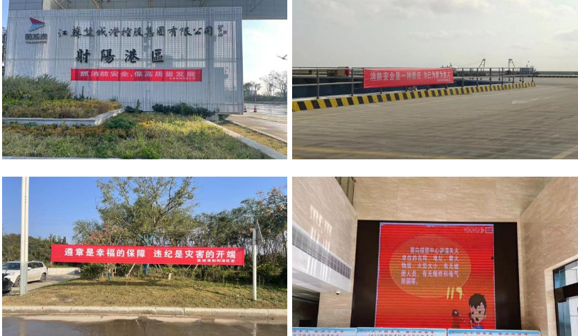 注重宣傳引導(dǎo),在增強(qiáng)輻射力帶動力上下功夫。為做好消防宣傳月活動,進(jìn)一步普及消防安全知識,全面提升港區(qū)全員的消防安全意識,提高自護(hù)、自救和互助能力,射陽港區(qū)通過在港區(qū)張貼消防宣傳海報,懸掛消防宣傳橫幅,辦公區(qū)大屏循環(huán)播放消防安全宣傳片等方式,大力宣傳消防安全科普知識,增強(qiáng)港區(qū)全員消防安全意識。