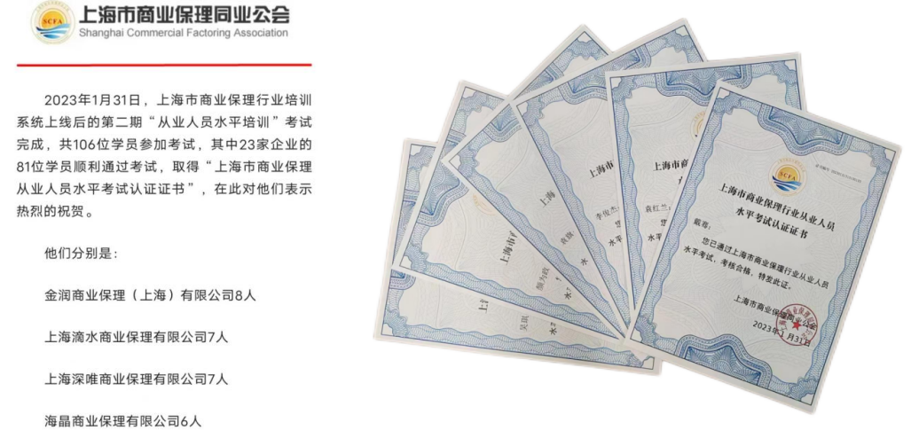 近日,海晶商業保理有限公司6名員工參加上海市商業保理水平培訓,順利通過考試并取得認證證書。考試通過人次在上海市商業保理行業名列前茅,充分展示了出色的專業水準。