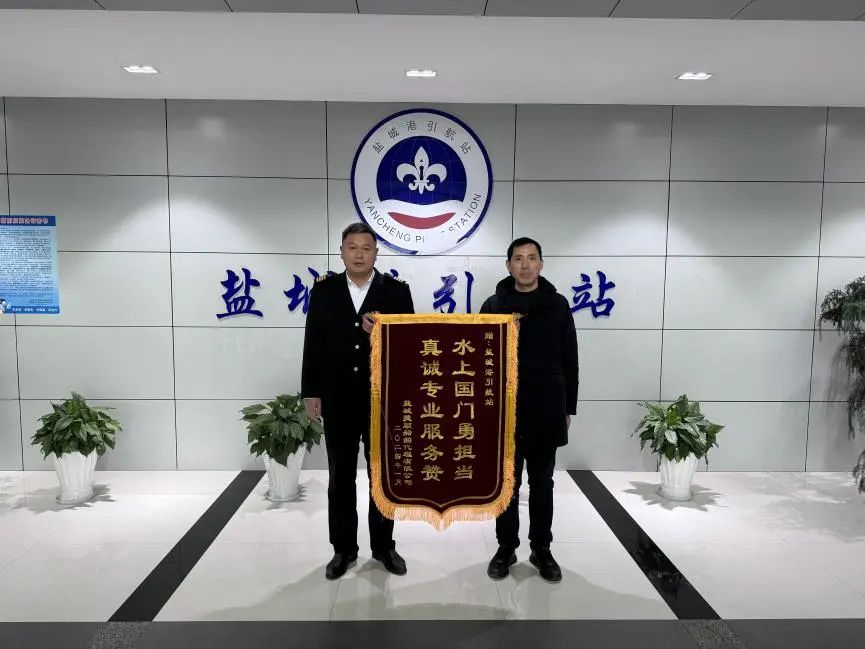 鹽城港引航站收到江蘇鹽城港智慧港口有限公司、中天大豐海纜有限公司、鹽城捷順船舶代理有限公司的三面錦旗