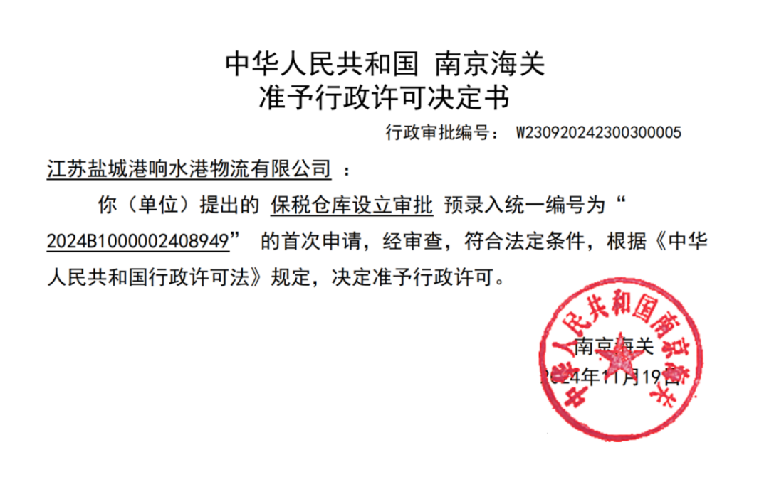 經(jīng)過一系列申報、審批流程,響水港物流有限公司公用型保稅倉成功獲得南京海關(guān)的行政許可,并于12月2日下發(fā)行政許可決定書。標(biāo)志著響水地區(qū)首個“公用型保稅倉庫”正式批準(zhǔn)設(shè)立。