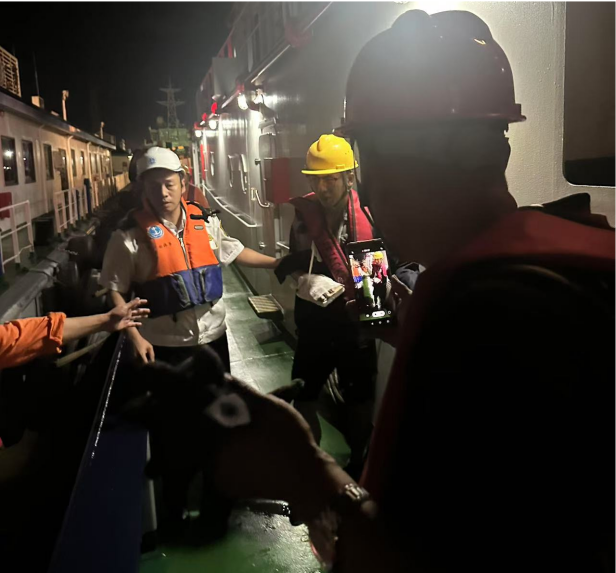 第一時(shí)間,“黃海拖06”輪全體船員迅速就位,整裝待發(fā)。當(dāng)晚正值臺(tái)風(fēng),惡劣天氣令視線模糊、航行艱難。但船長(zhǎng)沉穩(wěn)果敢,憑借豐富的經(jīng)驗(yàn)與嫻熟的技術(shù),依托先進(jìn)設(shè)備和精準(zhǔn)導(dǎo)航,克服了海上復(fù)雜的氣象條件和航行風(fēng)險(xiǎn),謹(jǐn)慎把控航向與速度,駕馭拖輪沖破風(fēng)浪,直撲航行于濱海港區(qū)附近的“海鑫成”輪。航行途中,船員們分工明確、協(xié)同作戰(zhàn),密切監(jiān)控海況與船舶動(dòng)態(tài),及時(shí)調(diào)整策略保障航行安全,以高度的專業(yè)素養(yǎng)和使命感,于波濤洶涌間開辟出一條安全通道,成功將受傷船員轉(zhuǎn)移到拖輪上。