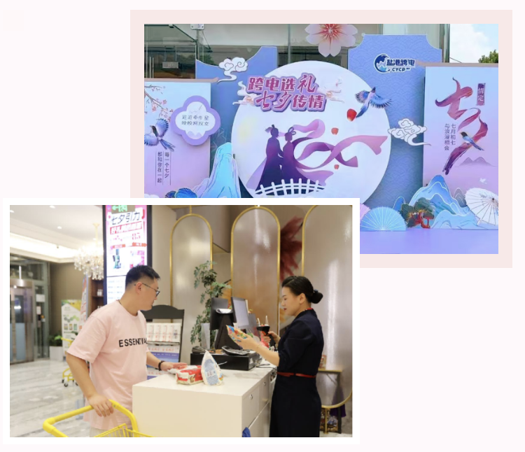 七夕之美,在于鵲橋相會的動人傳說。寶龍店入口處,七夕主題展牌似鵲橋剪影舒展,與琳瑯滿目的美妝護膚品相映成趣,將傳統浪漫與現代時尚巧妙串聯,讓每一位進店者仿佛踏入跨越千年的“鵲橋”;射陽趣伏里店更在戶外搭建七夕專屬互動空間,打卡區里滿是情侶依偎的身影,心愿墻上寫滿真摯告白,成為七夕里定格幸福的溫馨角落。店內專業導購化身 “鵲橋使者”,貼心為顧客分析膚質、推薦商品,助力大家為摯愛挑選恰到好處的七夕禮物,讓每一份心意都化作燦爛笑顏。
