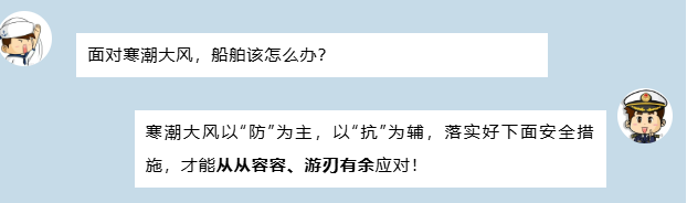 2、提前研判防抗措施。結(jié)合船舶抗風(fēng)等級,預(yù)先做好寒潮大風(fēng)防抗準備,抗風(fēng)能力較差的船舶選擇安全水域進行避風(fēng)。