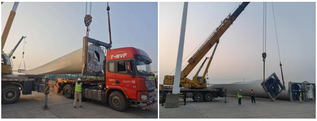 “百日攻堅”號角吹響以來,鹽城港保稅物流中心主動聚焦重大件貨物物流服務痛點難點,將風電葉片入庫作業列為重點攻堅任務。籌備階段,中心組建專項攻堅小組,綜合研判運輸銜接、場地調度、機械適配等多維度因素,制定“一貨一策”詳盡作業方案,對流程節點逐一梳理、閉環解決;同步協調管委會、海關等職能部門,針對風電葉片運輸道路通行需求,通過拆除影響通行的路燈等舉措保障道路通暢,進一步優化作業保障體系;搭建分工明確、協同高效的作業團隊,提供全程精細化服務。針對風電葉片“超長、超重”的特性,中心專項開展安全操作集中培訓,明確崗位職責、規范統一指揮流程,強化安全技術交底與風險點辨識控制,全方位筑牢大件作業安全防線,以專業能力為攻堅任務保駕護航。