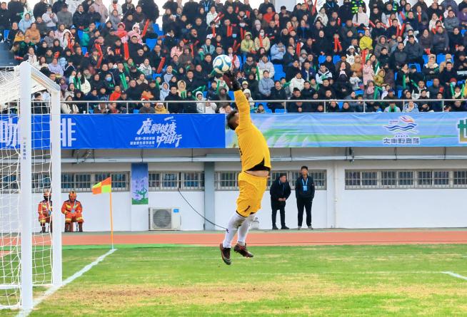 閃耀的綠茵場上,身著明黃色戰袍的陳龍泉在場上格外引人注目,經此一役已然成為賽事“網紅”。這位1988年出生的“大叔”,200斤的壯實身板,與對手陣中眾多00后小將形成鮮明對比。用一次次奮不顧身的撲救與永不言棄的奔跑,詮釋了鹽城港人的堅韌底色。面對對手一波又一波的猛攻,他始終屹立在球門前,撲擋、倒地、吶喊、鼓勁。體力不斷透支,比分逐漸拉大,但他從未動搖過哪怕一秒,用執著守住“最后一道防線”,也用行動點燃了隊友的斗志。