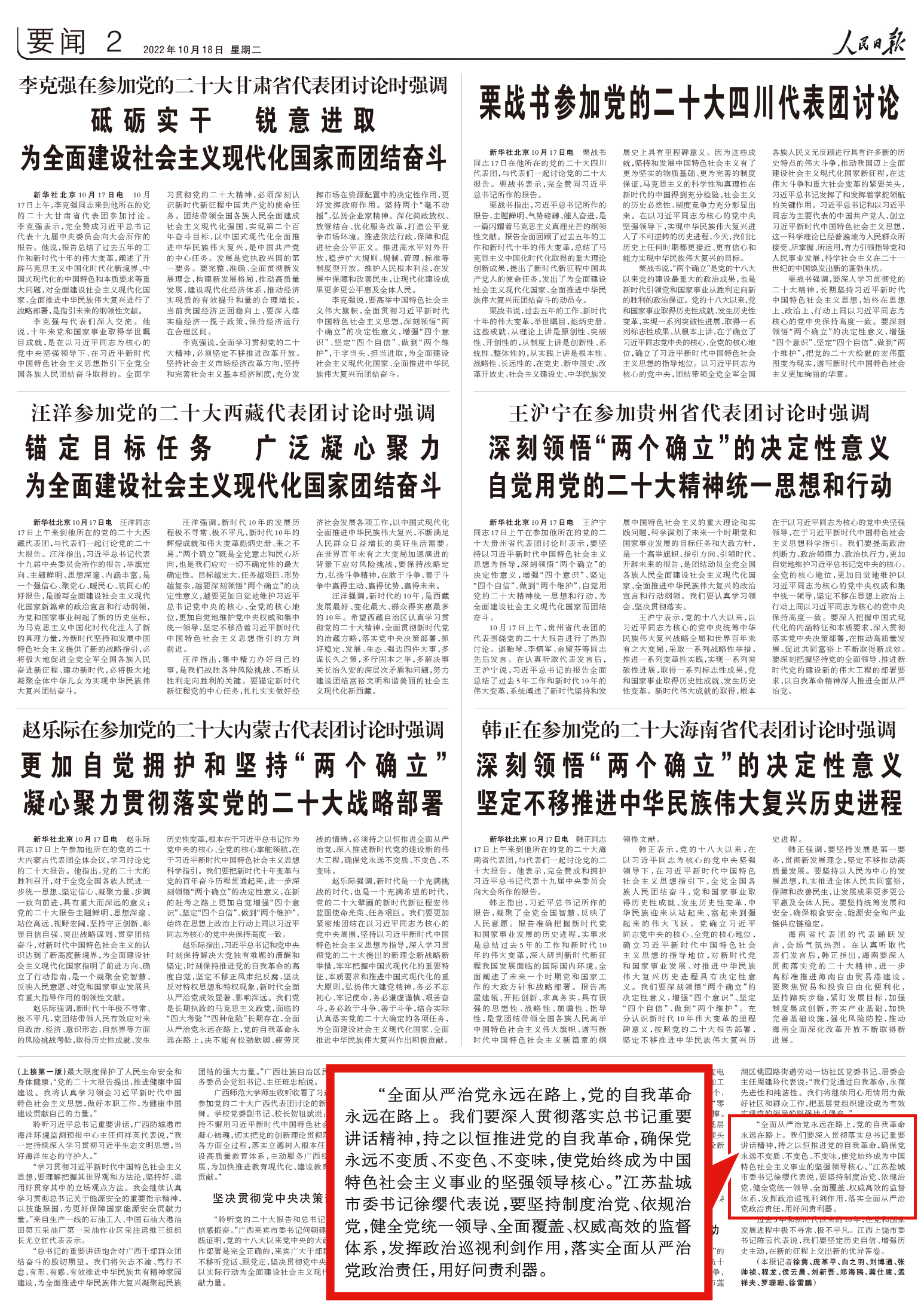 “全面從嚴治黨永遠在路上,黨的自我革命永遠在路上。我們要深入貫徹落實總書記重要講話精神,持之以恒推進黨的自我革命,確保黨永遠不變質、不變色、不變味,使黨始終成為中國特色社會主義事業的堅強領導核心。”江蘇鹽城市委書記徐纓代表說,要堅持制度治黨、依規治黨,健全黨統一領導、全面覆蓋、權威高效的監督體系,發揮政治巡視利劍作用,落實全面從嚴治黨政治責任,用好問責利器。