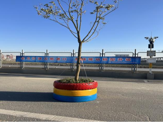 針對(duì)地磅站臺(tái)位置地處碼頭邊緣的現(xiàn)狀,為有效防止車輛在運(yùn)輸或掉頭拐彎過(guò)程中,誤闖碼頭或誤滑海域等安全隱患,開(kāi)展“修舊利廢”行動(dòng),誤闖碼頭或誤滑海域等安全隱患,踐行“修舊利廢”行動(dòng),利用2套支座、4根Φ40的廢舊鋼絲繩,支座選用預(yù)埋定位螺栓,高標(biāo)號(hào)水泥澆筑固定,制作一套安全防護(hù)車擋;利用廢舊輪胎循環(huán)制作路邊安全警示“盆景”;聚焦修舊利廢“小舉措” 實(shí)現(xiàn)提質(zhì)增效“大提升”。