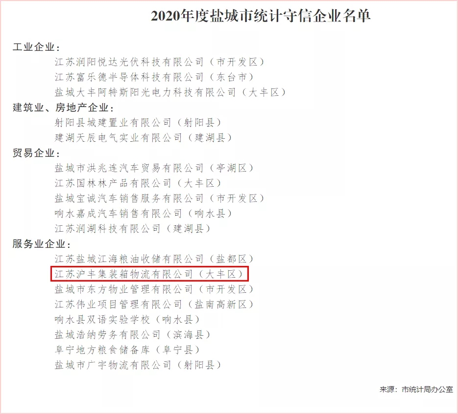 近日,通過嚴(yán)格審核,鹽城港滬豐集裝箱公司被鹽城市統(tǒng)計局評為“2020年度統(tǒng)計守信企業(yè)”,充分體現(xiàn)了滬豐公司重視和加強誠信管理體系建設(shè)所作出的努力,對塑造公司誠信經(jīng)營形象、提升物流市場競爭力具有重要意義。