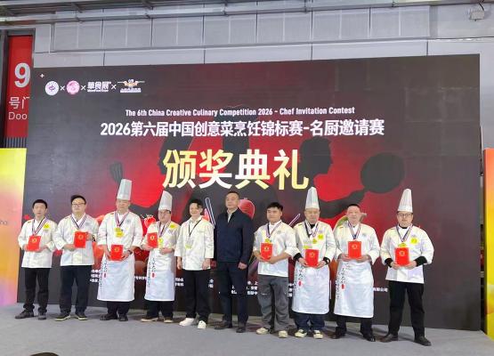 近日,在2026第六屆中國創意菜烹飪錦標賽--名廚邀請賽的頒獎舞臺上,港泊鶴灣酒店的廚師李青嶺、劉明園兩位廚師以出色表現憑借《掌上明珠》《鮑汁春筍扣鴨脯》《鶴鄉靚湯海鮮盅》等特色菜品,雙雙榮獲個人賽金獎。