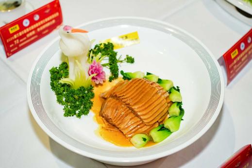 團隊協作,彰顯鶴鄉餐飲實力。在團體賽環節,港泊鶴灣酒店團隊更是展現了強大的協作能力與品牌特色。參賽菜品《掌上明珠》以益智去膘鴨脯肉為核心,搭配精致的鶴形食雕,既體現了射陽“鶴鄉”的地域文化符號,又凸顯了食材的本真風味;《鮑汁春筍扣鴨脯》則將鮑汁的醇厚與春筍的清鮮完美融合,層次分明、口感豐富;《鶴鄉靚湯海鮮盅》則以本地海鮮為原料,用清鮮的湯底還原食材本味,傳遞出鶴鄉的自然饋贈,在賽場中盡顯“鶴鄉名片”。