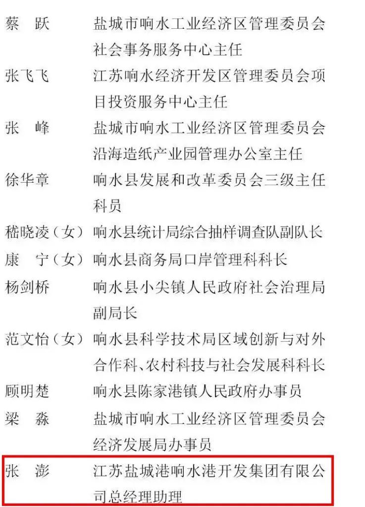 近日,經省委、省政府批準,市委、市政府決定表彰一批鹽城市沿海地區產業高質量發展先進集體和先進個人。江蘇鹽城港響水港開發集團有限公司總經理助理張澎同志榮獲“鹽城市沿海地區產業高質量發展先進個人”榮譽稱號。